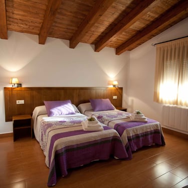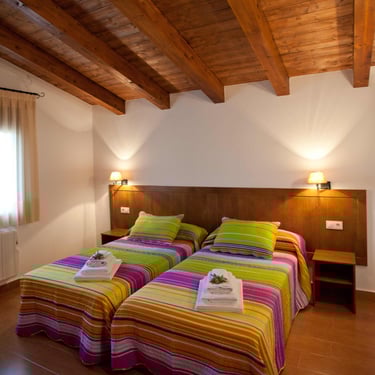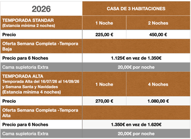 Tiene tres habitaciones dobles con camas de 105cm y con posibilidad de camas supletorias y dos cuartos de baño completamente equipados.