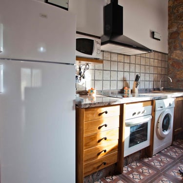 Cocina con todos los utensilios, dotada con horno, microondas, lavavajillas, lavadora, frigorífico, cafetera de cápsulas Nespreso, tostadora, exprimidor de zumos, ...
