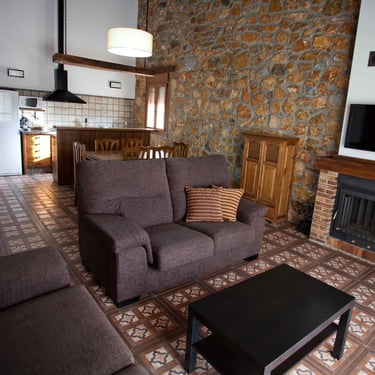 Es una hermosa casa con fachada de piedra y cubierta de madera con un amplio salón con chimenea y calefacción en toda la casa.